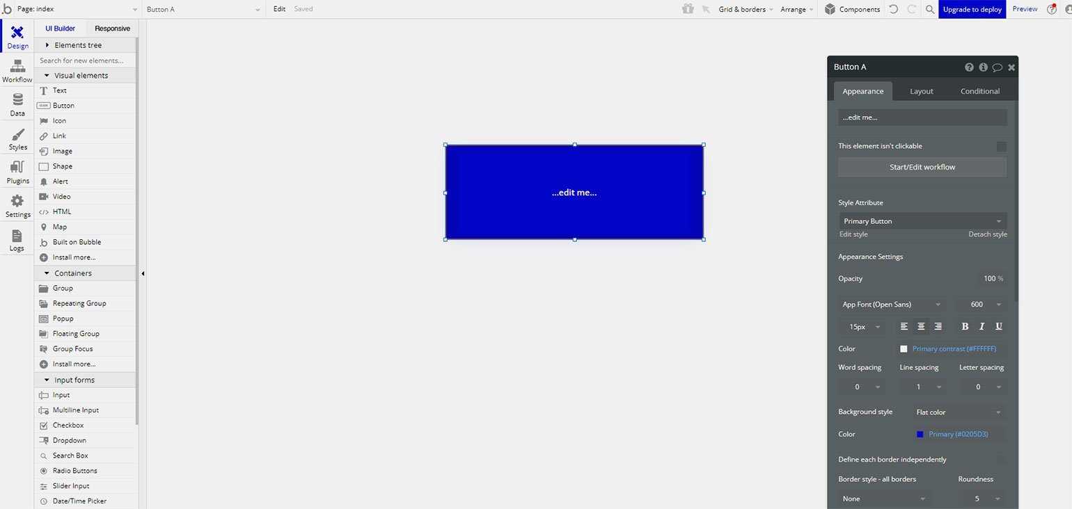 Продвинутый WYSIWYG-редактор, заточенный под сайты со сложной логикой и базами данных. Можно собрать маркетплейс или соцсеть и даже сделать аналог мобильного приложения с помощью сервиса Web View. Работа в Bubble построена поэтапно: сначала нужно добавить на страницу все необходимые элементы, а потом настроить их поведение.