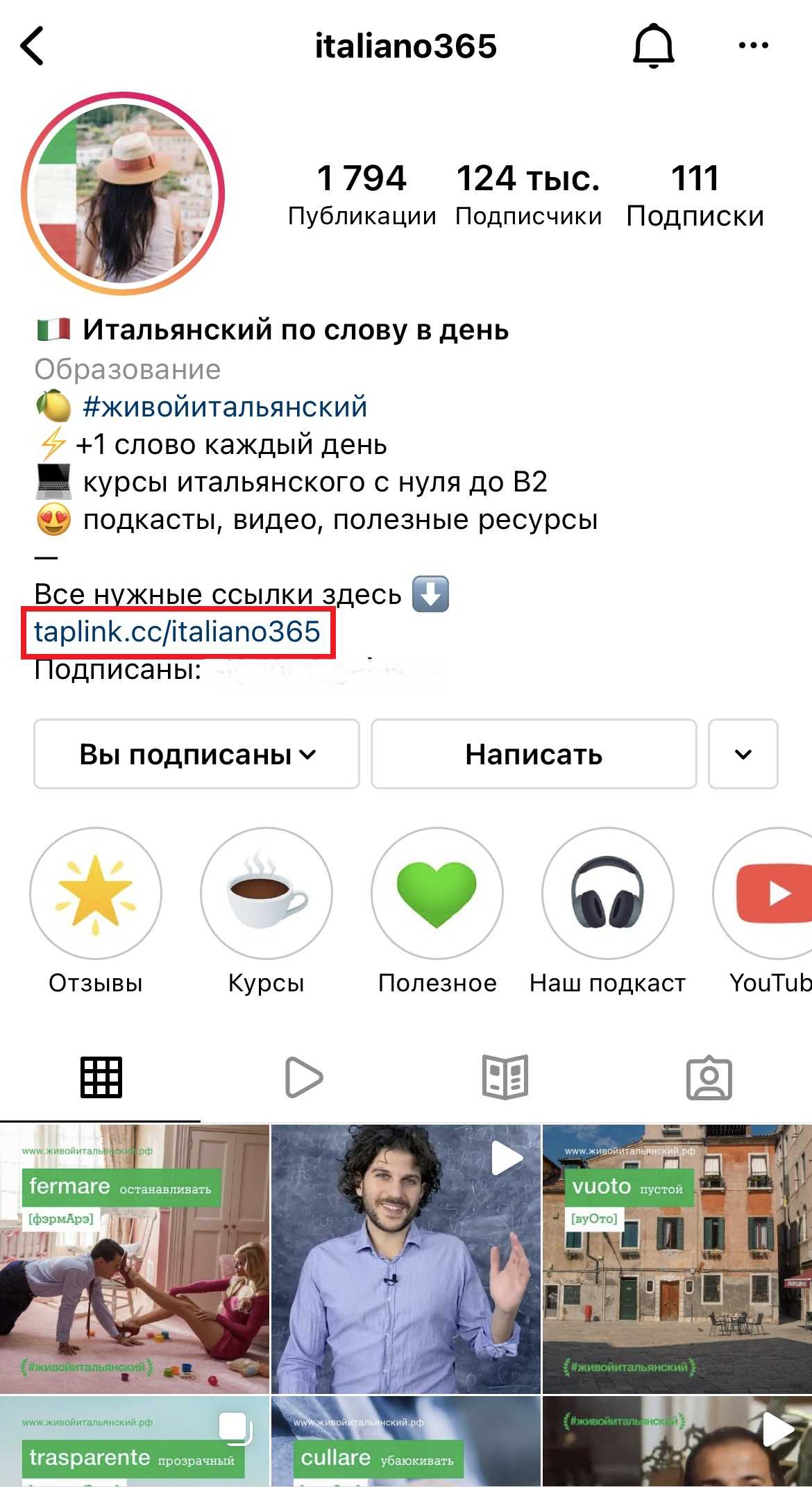 Создайте страницу в Taplink и разместите короткую ссылку в профиле Instagram. На гифке — пример наполнения страницы от создателей курсов итальянского языка