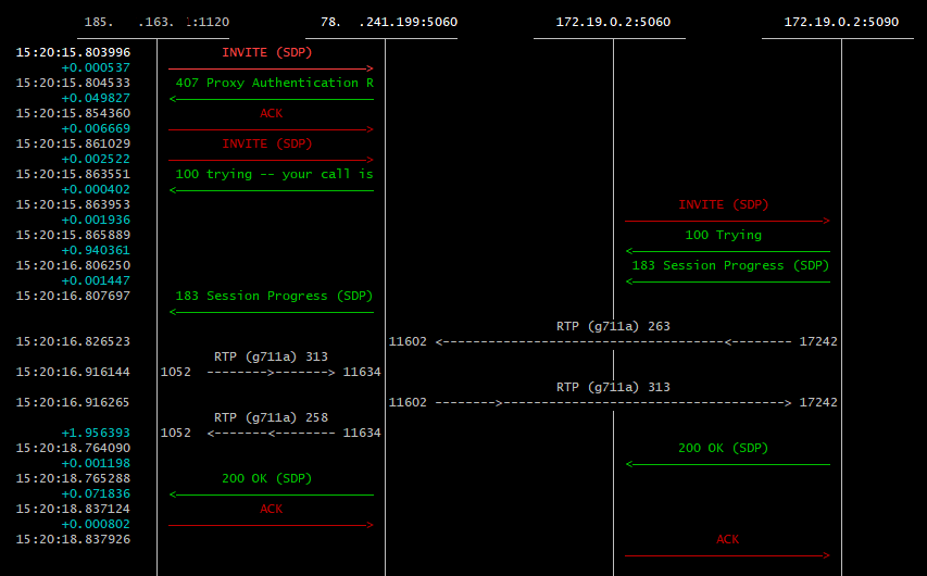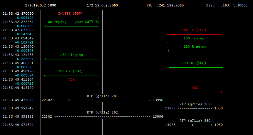 185.***.163.**:1120 — IP адрес абонента А78.**.241.199:5060 — публичный IP адрес Kamailio172.19.0.2:5060 — приватный IP адрес Kamailio используемый для работы с FreeSWITCH172.19.0.2:5090 — IP адрес FreeSWITCH