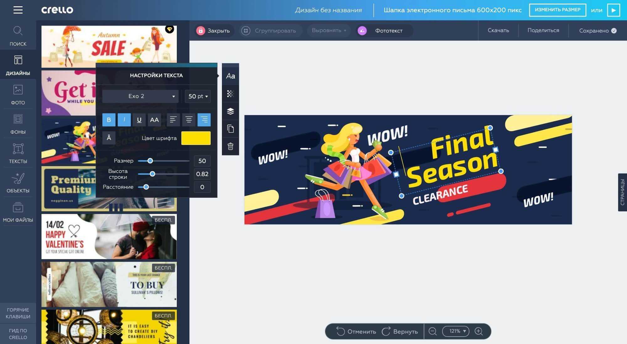 Чтобы экспериментировать было легче, используйте шаблоны. Есть множество онлайн-инструментов, которые предлагают уже готовые решения. Например, Canva или Crello. При желании шаблон можно отредактировать практически до неузнаваемости, используя собственные изображения и шрифты.