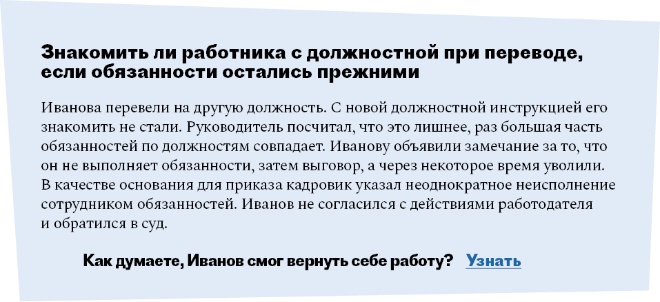 | Работнику предложили подписать старую должностную | 90 | Неэффективный сотрудник является одной из серьезных проблем, с которой сталкиваются многие компании. | |