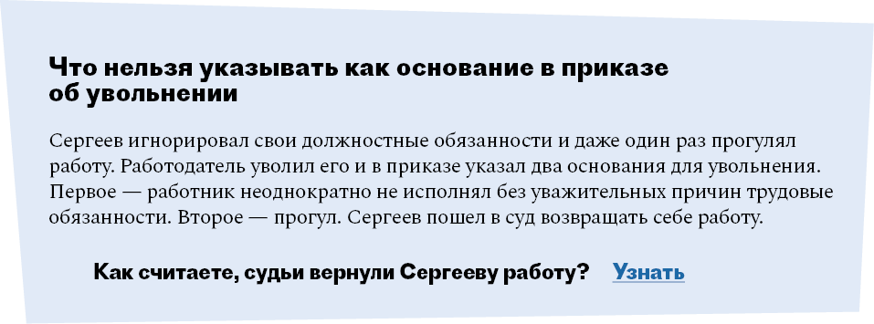 | Определение проблемы | 262 | Почему акты нужно зачитывать вслух. Что нельзя указывать в приказе об увольнении как основание. | |