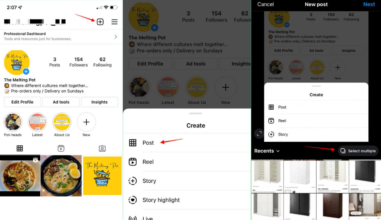 Once you have the perfect images or videos lined up, you can start creating an Instagram carousel post using the steps below:
