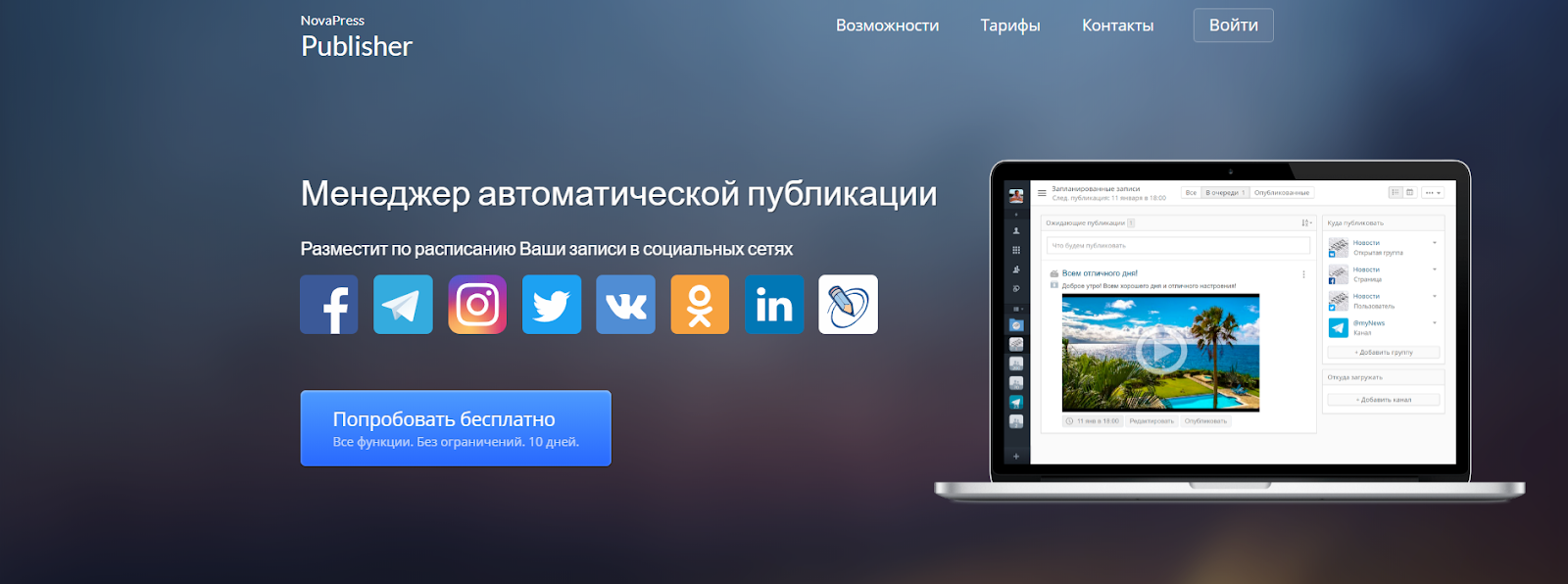 Публикация в 8 соцсетей («ВКонтакте», Facebook, Telegram, Instagram, Twitter, «Одноклассники», LinkedIn, LiveJournal)