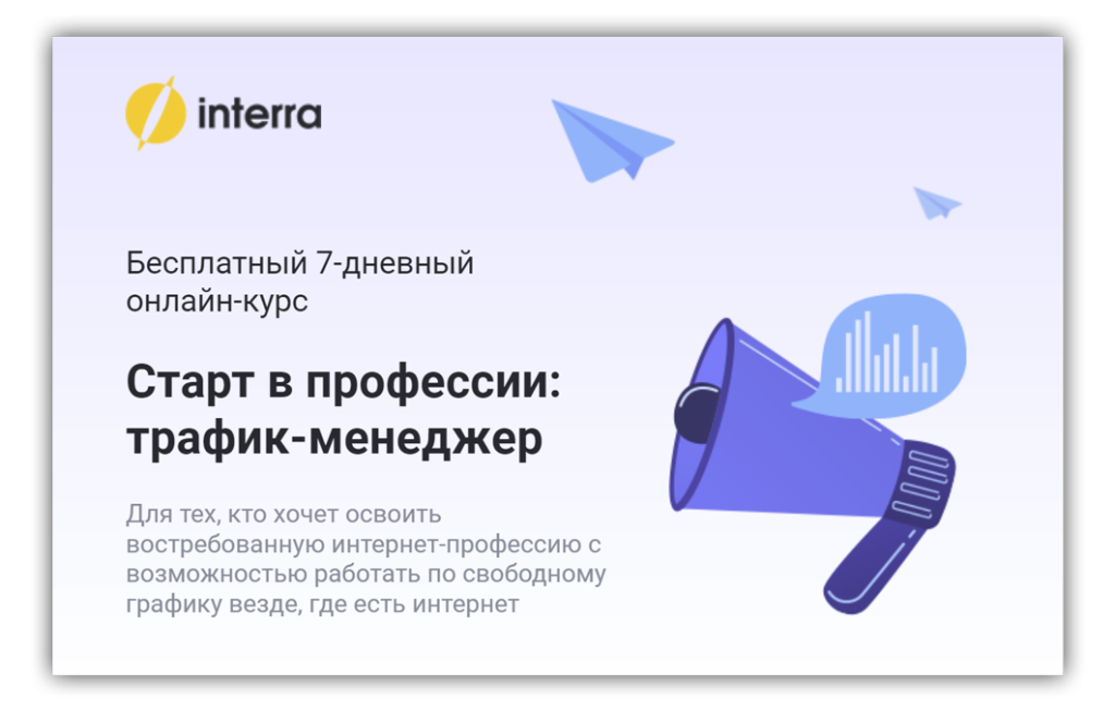 Если вы надумали пройти обучение по профессии трафик-менеджер, лучшее, что можете сделать — пройти бесплатный 7-дневный онлайн-курс от школы Interra. За ноль рублей и ноль копеек вы получаете ценное вводное обучение в профессию специалиста по трафику.
