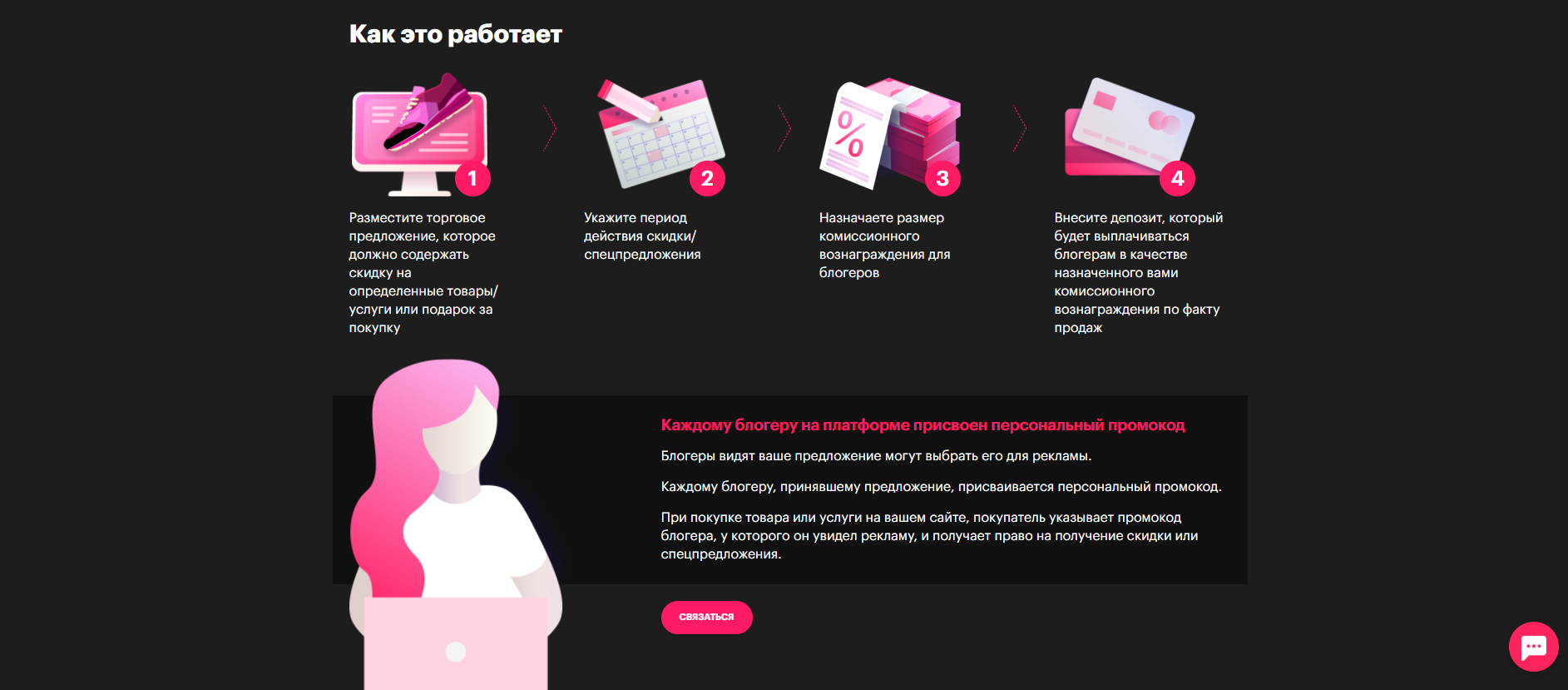 В Getblogger не нужно искать инфлюенсера. Задаешь настройки и получаешь рекламу. Сервис идеально подходит для случаев, когда в рекламной кампании есть промокод или скидка на рекламируемый товар.