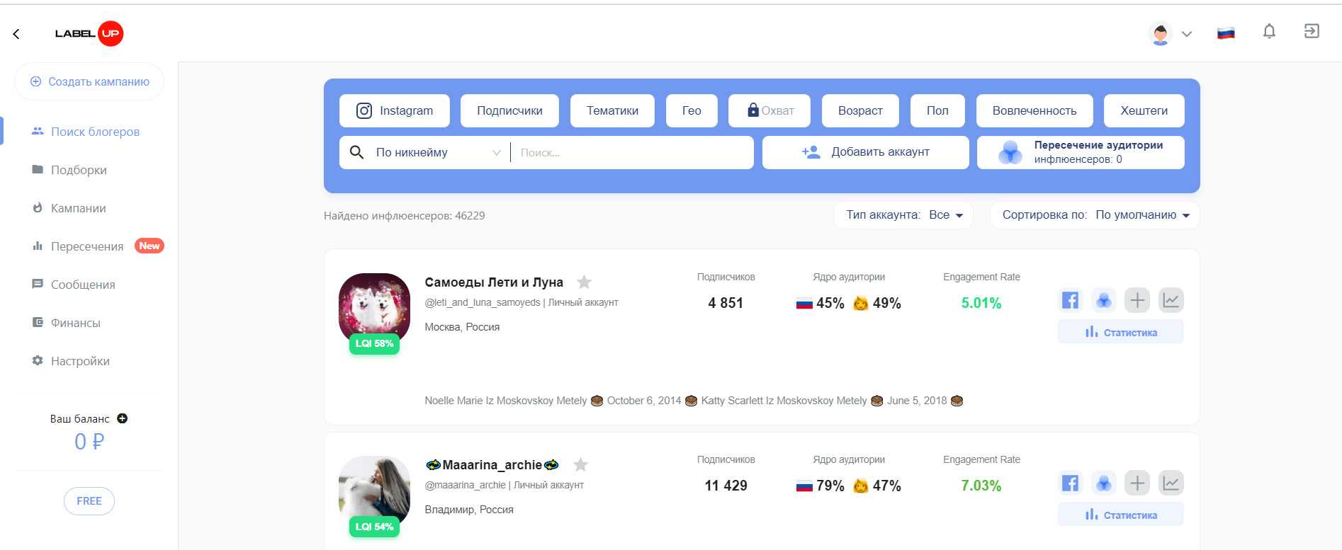Есть открытая версия, где видны первые пять блогеров из поиска можно запустить рекламную кампанию, пополнить внутренний счёт, но нельзя искать блогеров по никнейму и писать им сообщения. PRO-доступ к сервису — от 1000 ₽.
