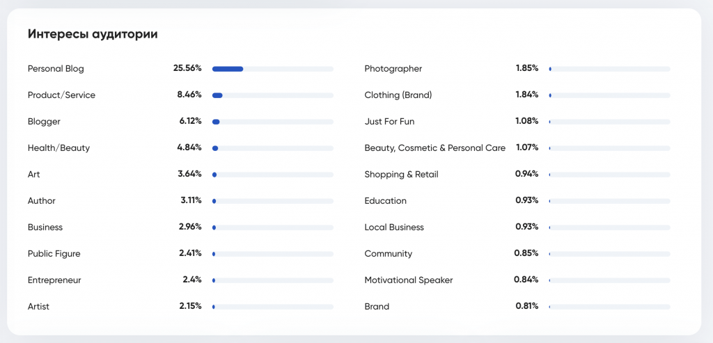 Если кратко — это категории бизнес-аккаунтов, на которые подписаны подписчики блогера. То есть, например у меня есть подписчик Андрей. Так вот этот показатель показывает, на какие аккаунты подписан Андрей.