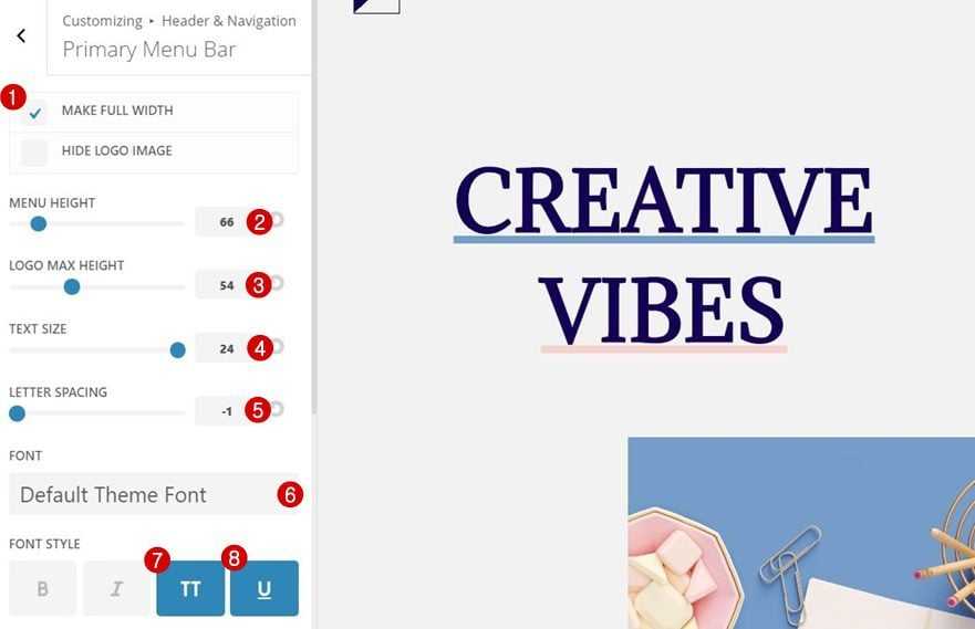 Then, you’ll need to make some changes to the Primary Menu Bar by going to your WordPress Dashboard > Appearance & Customize. Once you’re there, navigate to your Primary Menu bar and apply the following settings to your primary menu to achieve the exact same result: