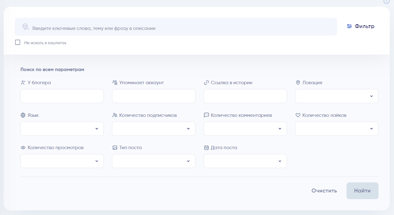 - Отфильтровать нужные профили по тематике, ключевому слову, меткам, числу подписчиков и др.