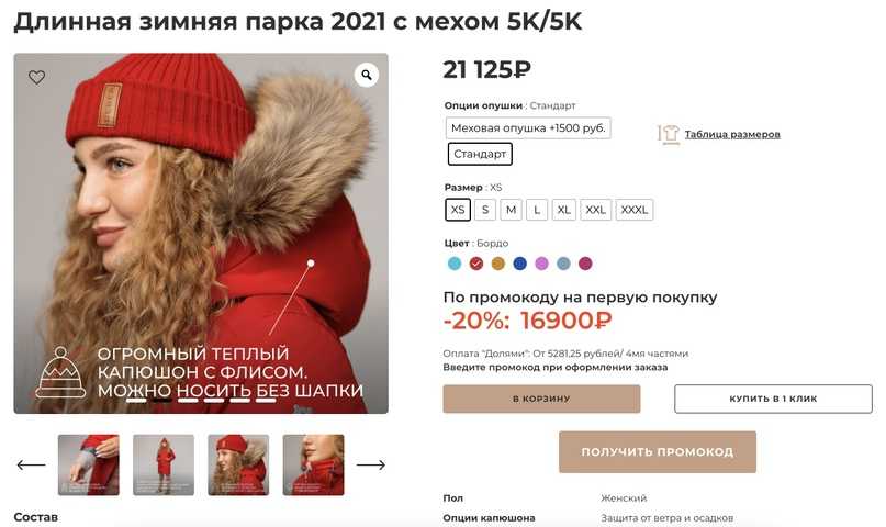 стандартная карточка товара (галерея изображений, описание, характеристики);