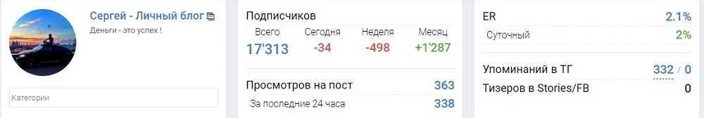 - Следите за статистикой. Это обязательно для дальнейшего развития: чтобы со временем зарабатывать все больше, нужно наращивать аудиторию и работать на уровнем вовлеченности. Обязательно отслеживайте эти показатели: если со временем аудитория растет, а ER не падает слишком сильно, значит, все идет хорошо. Если что-то не так, меняйте подход к контенту или монетизации.