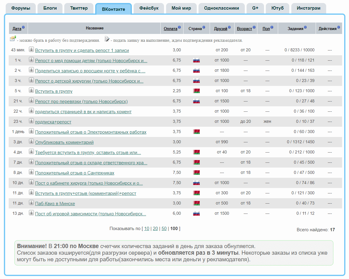 Рубрика «Все задания» содержит перечень заданий, доступных для выполнения в данный момент. Надо понимать, что бесплатная накрутка лайков, сообщений или подписчиков через ВкМикс для вас по сути является условно бесплатной, ибо за это придется платить, но не деньгами, а потраченным на выполнение чужих заданий временем.