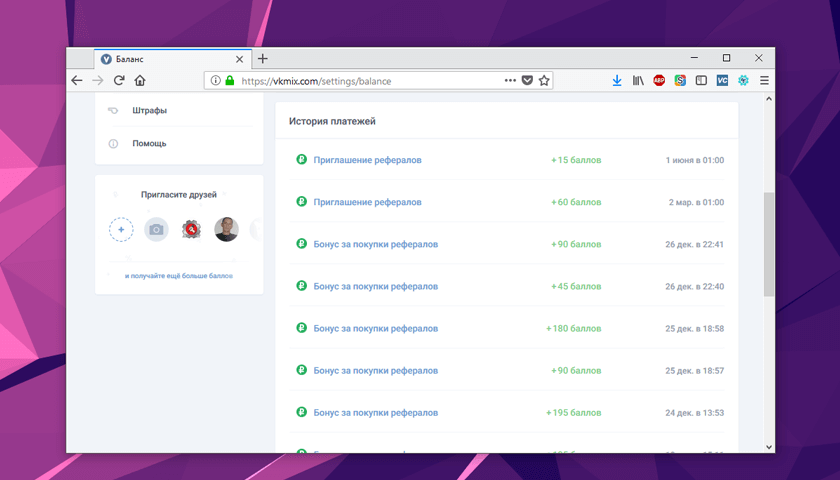 Чуть не забыл упомянуть, что кроме выполнения заданий на сервисе Vkmix предусмотрен ещё один способ заработка баллов — партнерская программа. За каждого приглашенного человека, который выполнит не менее 5 заданий, вы получите 15 баллов. Кроме этого, вы будете получать 15% от суммы заработка вашим рефералом и 15% от баллов, которые купил ваш реферал.