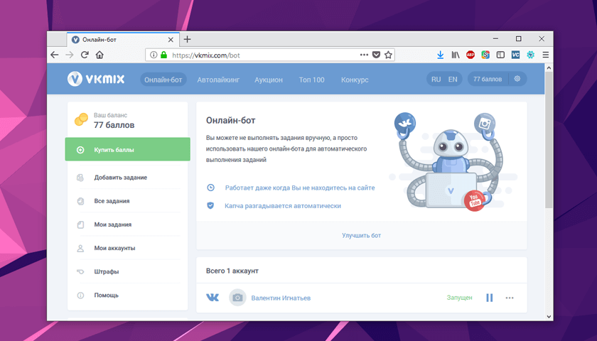 Надо бы еще вкратце рассмотреть дополнительные средства, которые предлагает сервис VKMix пользователям для работы. Онлайн-бот помогает выполнять задания на полном автомате. Для его активации нужно просто добавить свои аккаунты, после чего он будет работать не покладая рук от вашего имени и зарабатывать баллы вам на баланс: