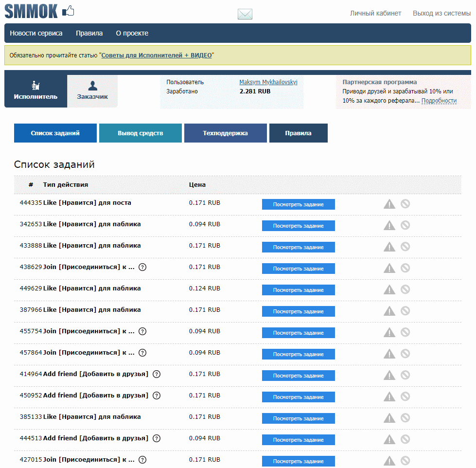 Работая в ВкМикс, вы будете выполнять различные задания, раскручивая сторонние странички. За каждое выполнение рекламодатель обязательно наградит вас баллами – своеобразной внутренней валютой. На баллы вы в дальнейшем закажете раскрутку собственных проектов (ибо превращать их в деньги и выводить как на VkTarget и ему подобных систем накруток нельзя). Если захотите – можно внести на проект деньги и раскручиваться платно (гораздо быстрее и эффективнее).