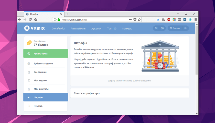 Данный сервис накруток имеет систему штрафов. Если пользователи, выполнившие ваши задания, совершают отменяющие действия (отписываются от ваших сообществ, убирают лайки с ваших публикаций или фотографий, и так далее), вы сможете оштрафовать их и вернуть потраченные на них баллы.