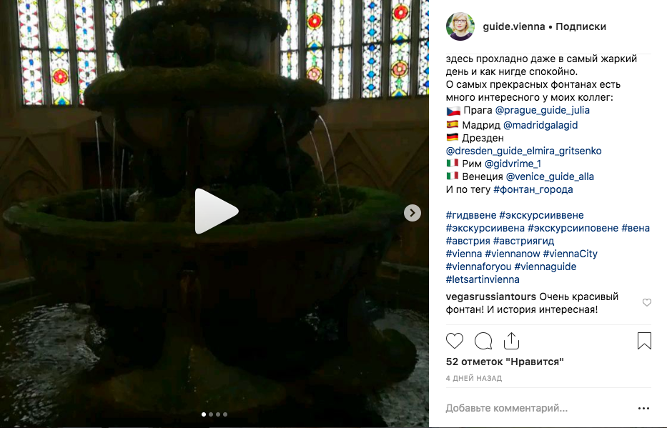 Экскурсовод рассказывает про интересный фонтан и делится аккаунтами коллег из других стран.