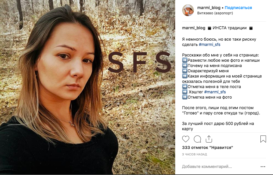 - SFS — «упоминание за упоминание». Для пиара используются аккаунты обычных подписчиков, незнаменитых блогеров.