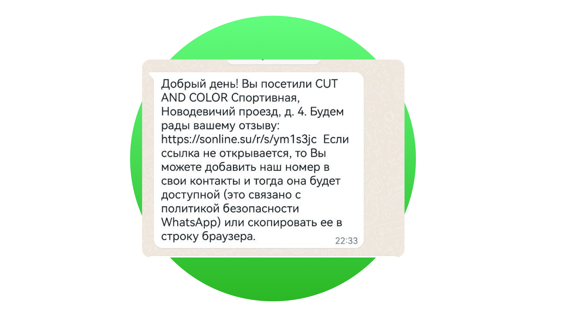 Часто причина, по которой клиент отказывается от покупки — внезапно возникшая сложность: не получилось оплатить заказ, не нашел информацию о расписании, не понял, как сделать покупку. Если вы видите, что пользователь интересовался чем-то у вас на сайте, но не совершил целевое действие, выйдите к нему напрямую — возможно, ему просто нужна помощь. Рассылка в WhatsApp* поможет ее оказать.