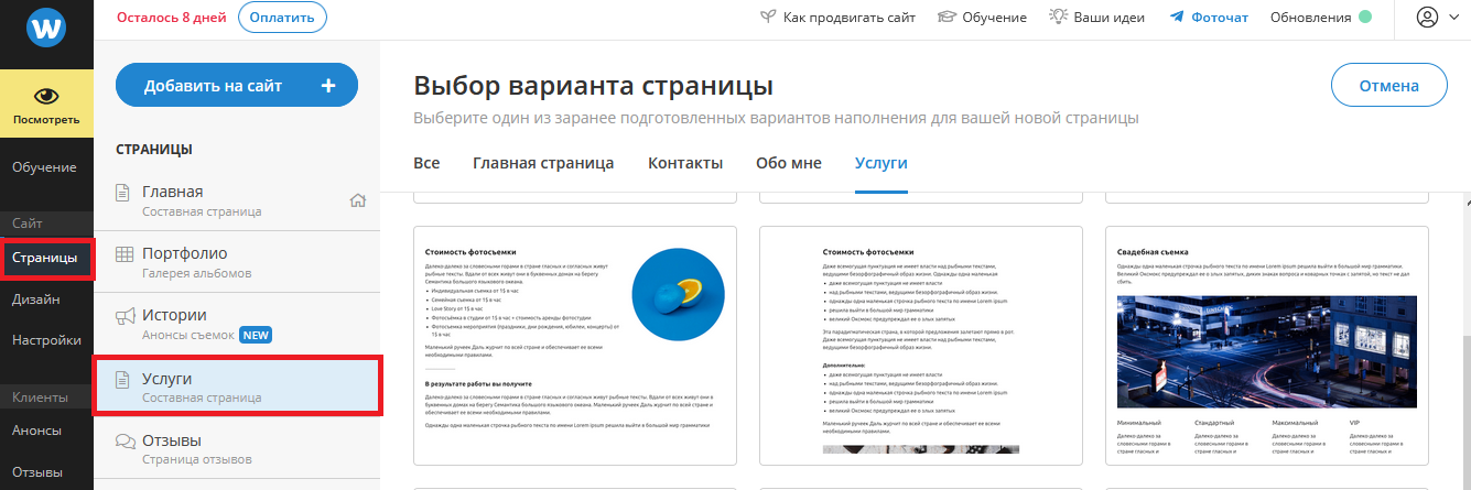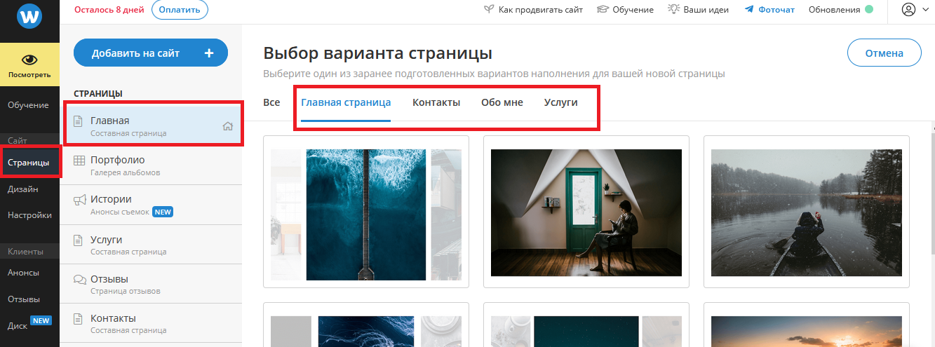 Создание страниц. В этом разделе можно добавлять новые страницы, а также редактировать их. Например, для выбора главной страницы, необходимо нажать на вкладку «Главная», и затем выбрать подходящий шаблон. По такому же принципу настраиваются и другие страницы.