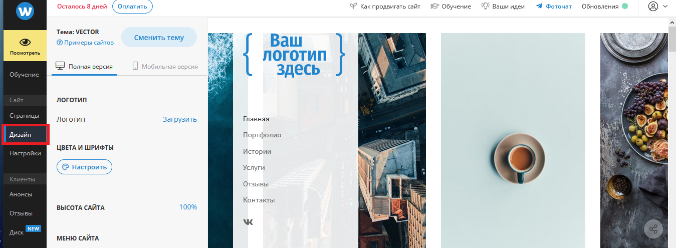 Дизайн. Здесь представлены визуальные настройки сайта. Можно переключать между полной версией и мобильной версией сайта. В данном разделе есть возможность добавлять логотип, настраивать цвета и шрифты, редактировать слайдеры, альбомы, и др. Все изменения, которые вы производите, будут видны сразу в области предпросмотра.