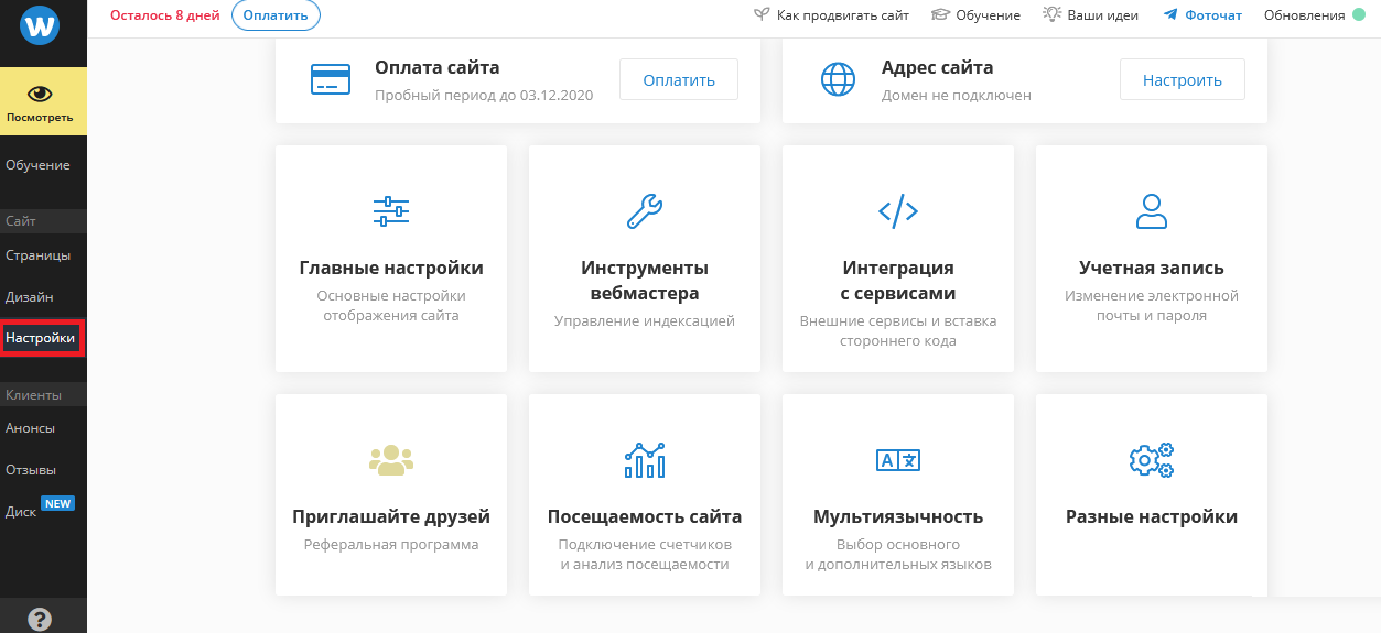 Настройки. В данном разделе можно подключить домен, так как изначально вам будет доступен временный. Если у вас есть домен, то можно это сделать сразу. Кроме того, здесь доступны возможности интеграции внешних сервисов и виджетов. С их помощью можно расшить функционал конструктора, например, добавив онлайн-консультирование, установив виджеты социальных сетей, заказа обратного звонка, а также получения уведомлений.