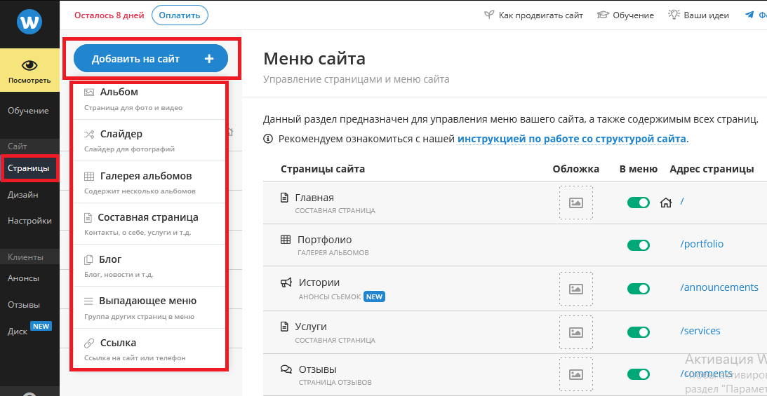 Чтобы добавить контент на страницу, нажмите на вкладку «Добавить на сайт». Ниже появится окно с элементами, которые можно добавить на сайт. Здесь вам будут доступны альбомы, слайдеры, галереи, составные страницы, блог, выпадающее меню, а также ссылка.