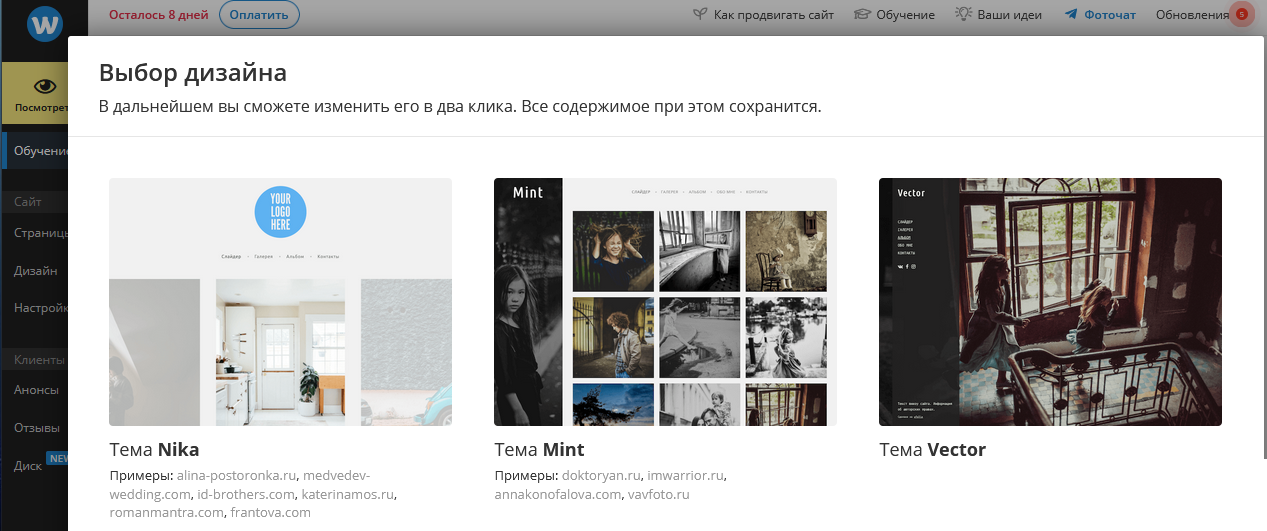 - Доступ к подключению платежных систем, чтобы новый сайт для фотографа стал не только портфолио, но и полноценной продающей площадкой.