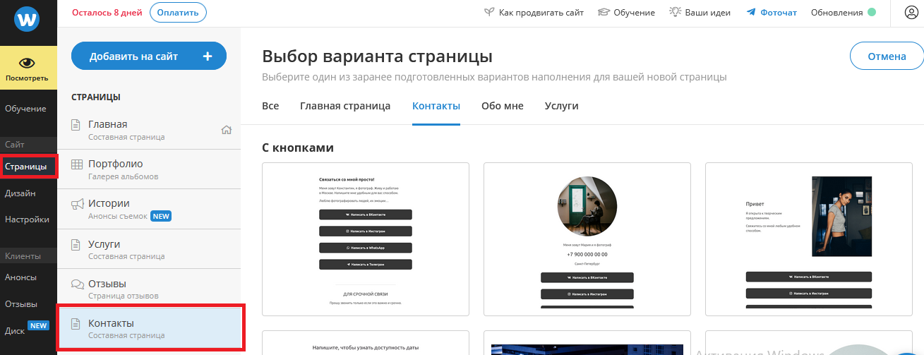 В данном разделе также доступна настройка отзывов. Например, можно создать форму, при помощи которой посетители будут делиться своим мнением в отношении ваших услуг. В контактах можно указать свои данные – телефон, электронную почту, мессенджеры, социальные сети и др. предоставленные шаблоны могут содержать кнопки.