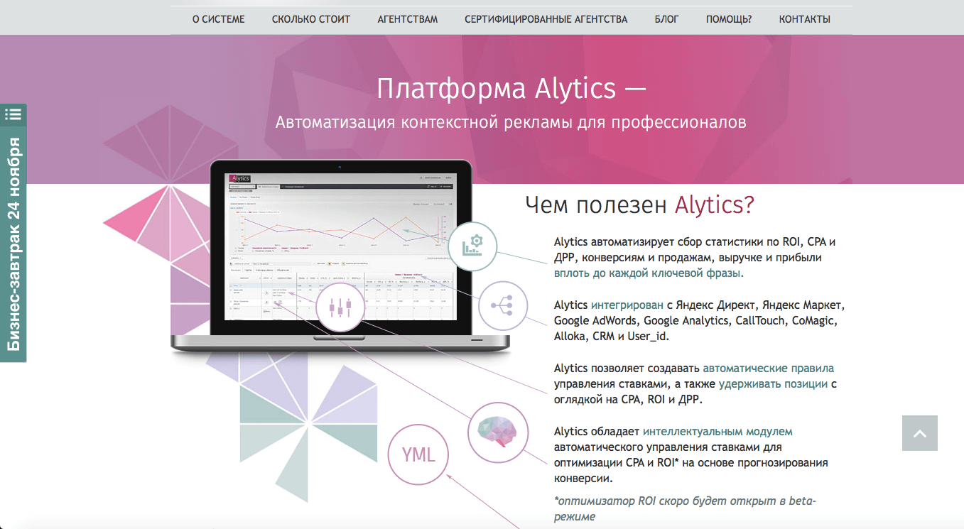 Работает практически со всеми известными площадками. Сервис ведёт аналитику по каждому ключевику и по отдельности управляет каждой кампанией. Есть различные встроенные модули, которые позволяют автоматизировать сбор статистики, генерирование объявлений и т. д. Система интегрируется с CRM-сервисом, позволяет дать права доступа другим пользователям