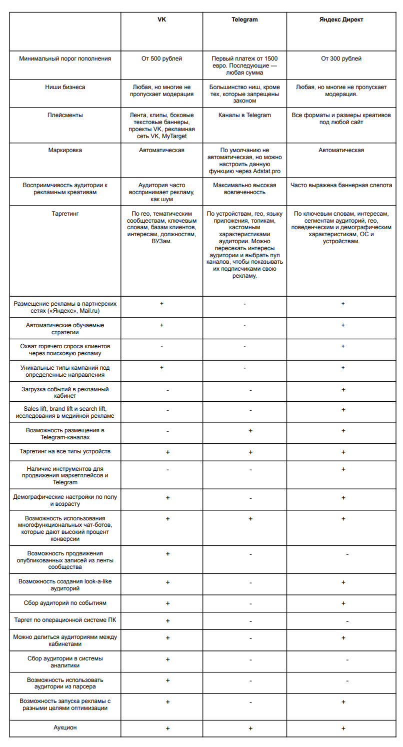 А напоследок давайте еще раз посмотрим на все плюсы и минусы каждой площадки в формате таблицы.