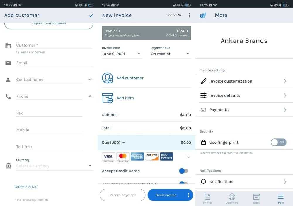 Известные функции выставления счетов включают автоматические напоминания для опоздавших клиентов, профессиональные шаблоны счетов, индивидуальный брендинг ваших счетов, отправку счетов и управление ими на мобильных устройствах, знание того, когда клиенты просматривают счет, автоматическое резервное копирование в облаке и многое другое.