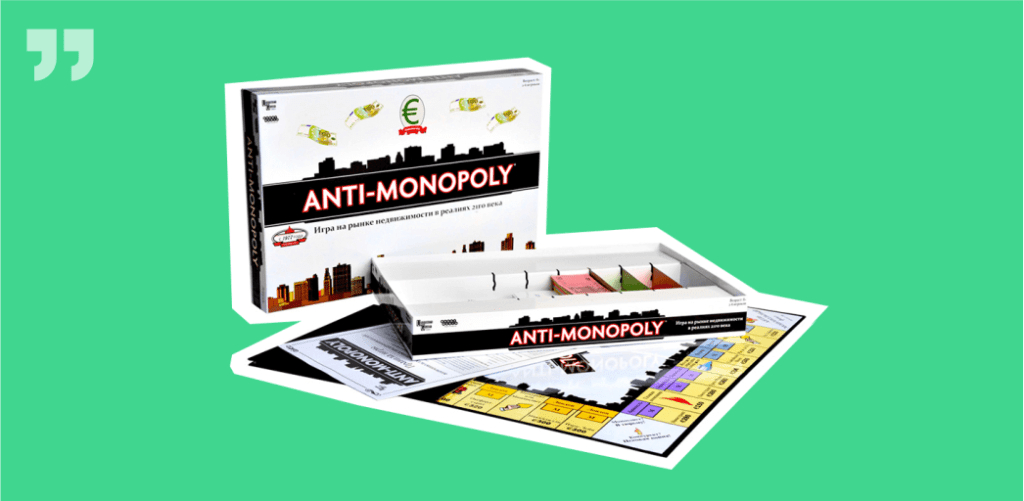 Время идет — рынок меняется. Не так давно вышла новая игра, которая учитывает условия изменившихся отношений в бизнесе. «Монополия» построена на том, что игрок должен стать монополистом, в «Антимонополии» в игру вступают конкуренты. Вы можете играть как за тех, так и за других, расширяя свою финансовую грамотность разным опытом. Ирония судьбы заключается в том, что игра «Антимонополия» подвинула реального монополиста по настольным играм — компанию Hasbro. Это ли не лучшая рекламная кампания игры?