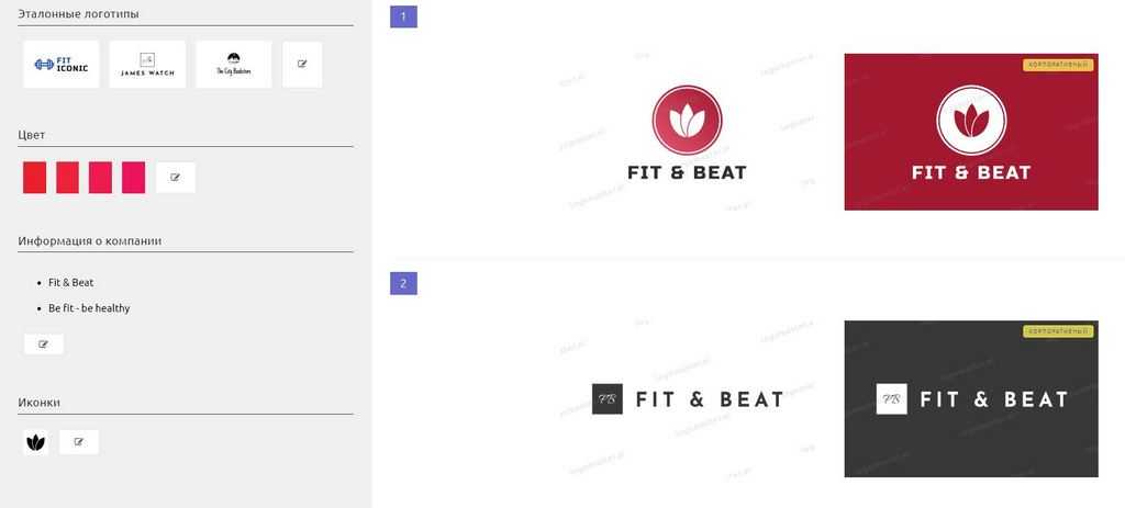 Logaster – тоже прекрасный онлайн-инструмент для создания логотипов, но на русском языке. Тут действует тот же принцип: вводите название компании, по желанию и слоган, выбираете тип будущей эмблемы, в конце подбираете ключевые слова, понравившиеся иконки и цвета. Правда, без регистрации лого вы получите только с водяными знаками.