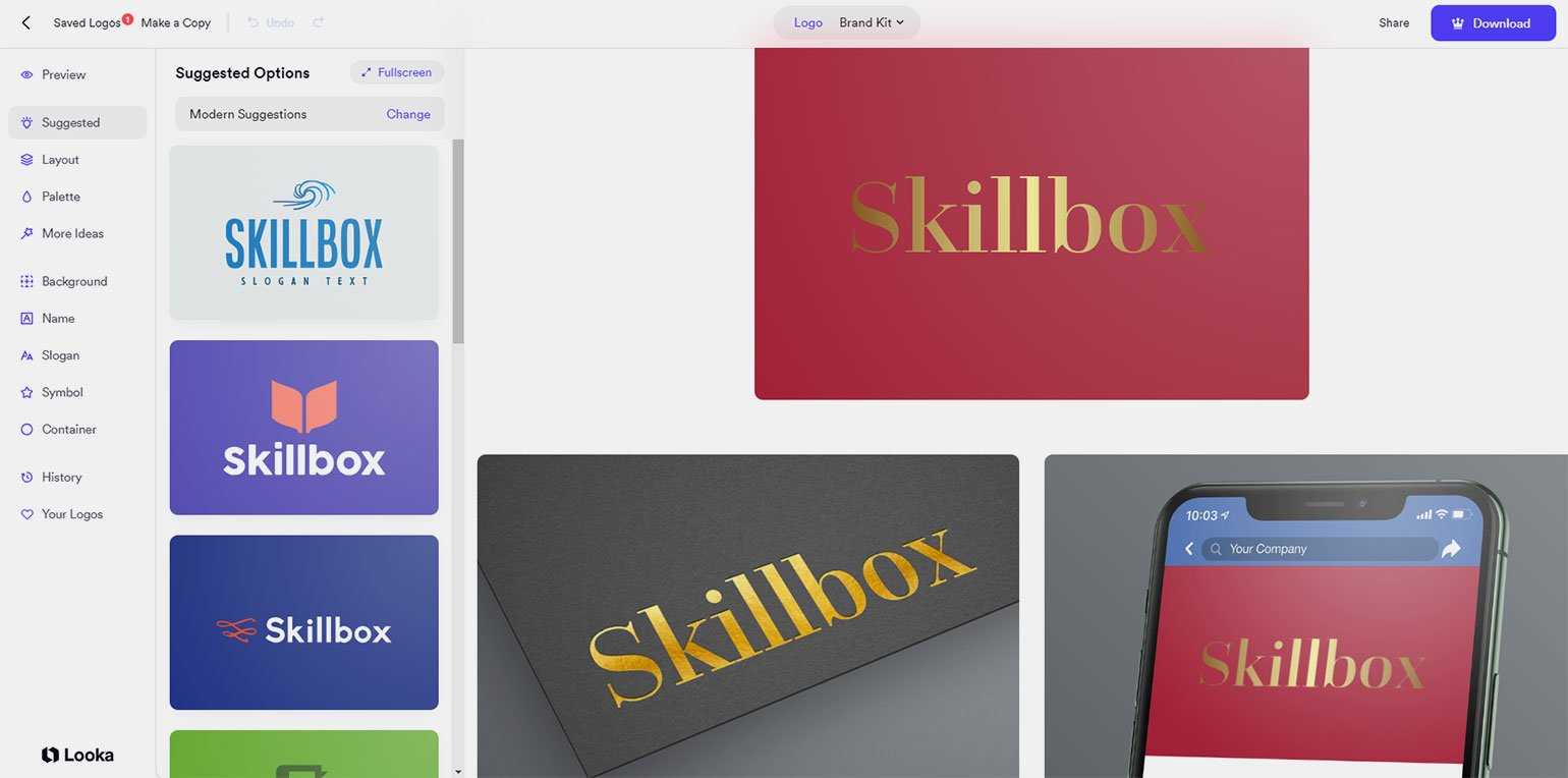 Looka — делает логотипы с градиентами и декоративными шрифтами