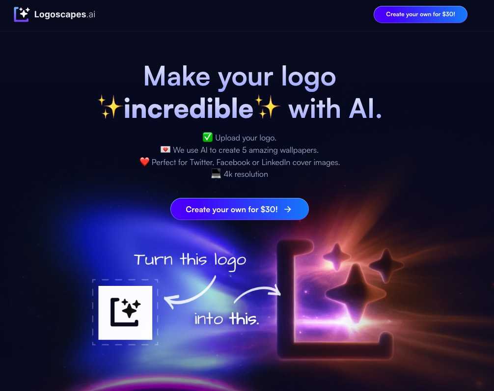 Сервис Logoscapes платный – на счете пользователя должно лежать не менее 30$. Создание логотипа происходит на основе предложенного шаблона. Далее искусственному интеллекту нужно задать направление работы, выбрав из девяти предлагаемых стилей пять. Есть и размеры, для которых требуется дополнительная плата в 15$. Кроме того, сервис позволяет делать обложки для соцсетей.