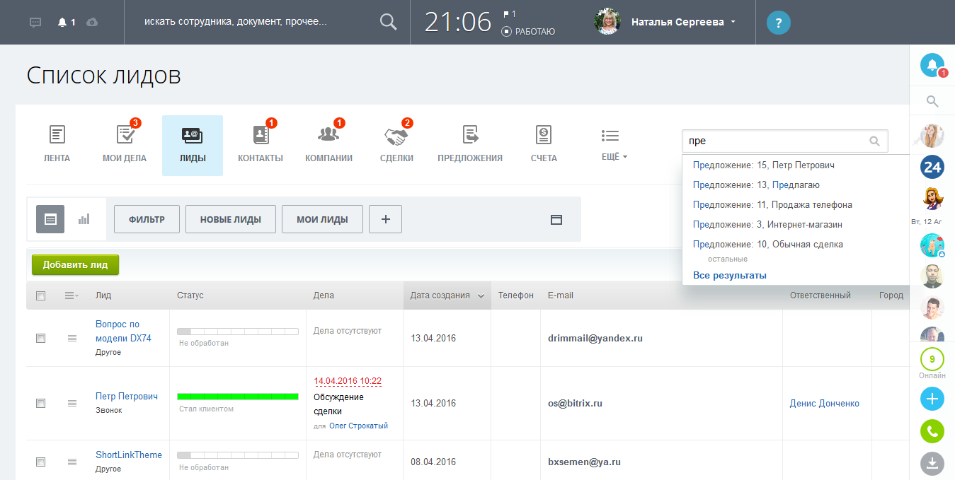 После того, как формы постепенно наполнятся, программа с легкостью сможет их обрабатывать. То есть среди вороха данных находить нужное. Система учета клиентов «Битрикс24» дополнена удобными поисковыми опциями. А сортировка информации возможна всеми возможными способами.