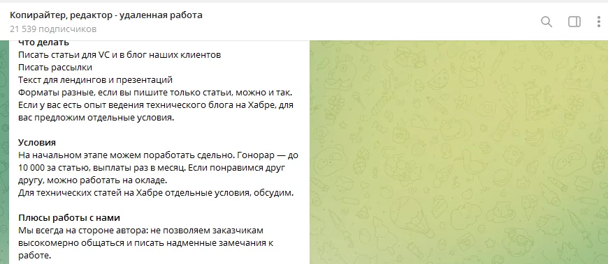 - Искать вакансии на авито или в телеграмм-группах. На это уйдет больше времени, но заказчики готовы платить намного больше. Примерная цена – от 100 рублей за 1000 символов.