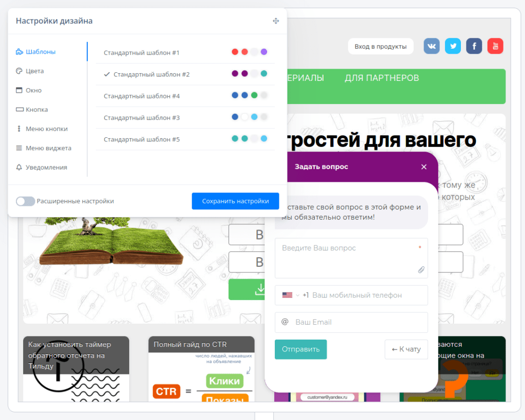 | 5 | Возможность изменять дизайн кнопки приглашения, цвета и расположение в окне чата. | Адаптация под дизайн сайта |