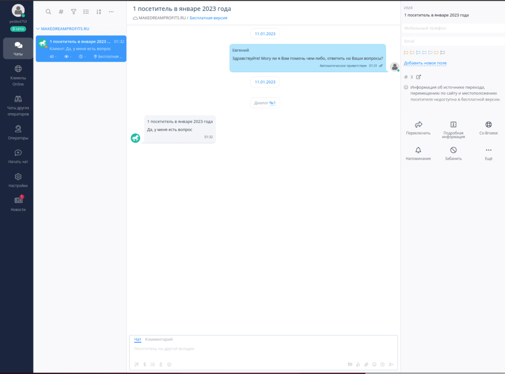 Малоизвестный онлайн-консультант, который обладает широким функционалом и может быть интегрирован со многими популярными CMS-системами.
