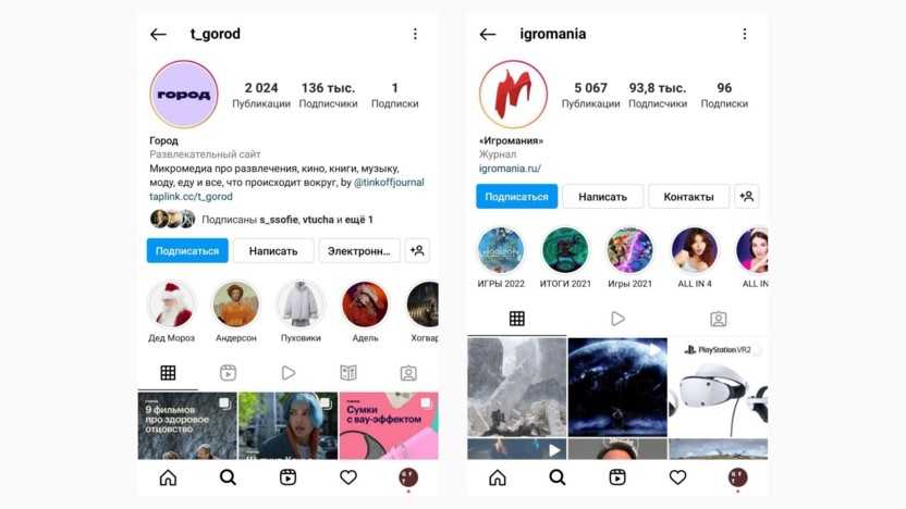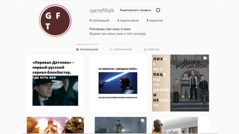 Мы сделали медиа про кино и видеоигры. В качестве источника постов и сторис – оригинальные статьи из блога нашего автора. Чтобы не совершать масслайкинг вслепую, мы стали искать аудиторию среди похожих аккаунтов: были выбраны «Т-Город» и «Игромания».