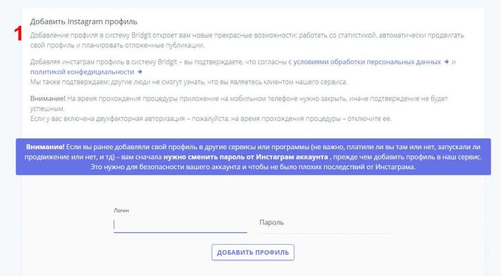 1. Для начала пройдите регистрацию и подтвердите ее. Затем нужно указать свой логин и пароль от Инстаграм.