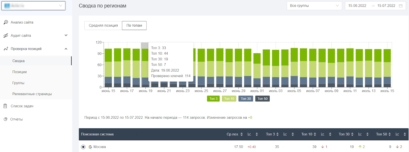 - Проверка позиций отдельно в Яндексе и Google по регионам и устройствам.