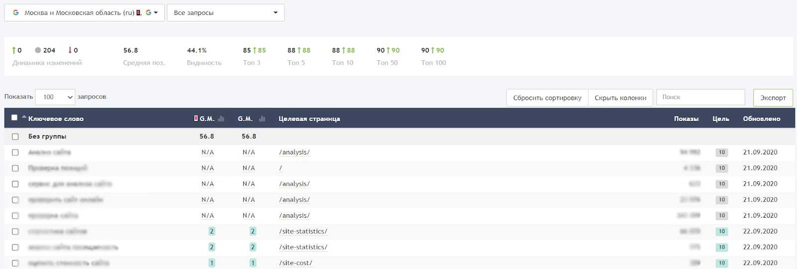 - Динамика позиций конкретной целевой страницы.