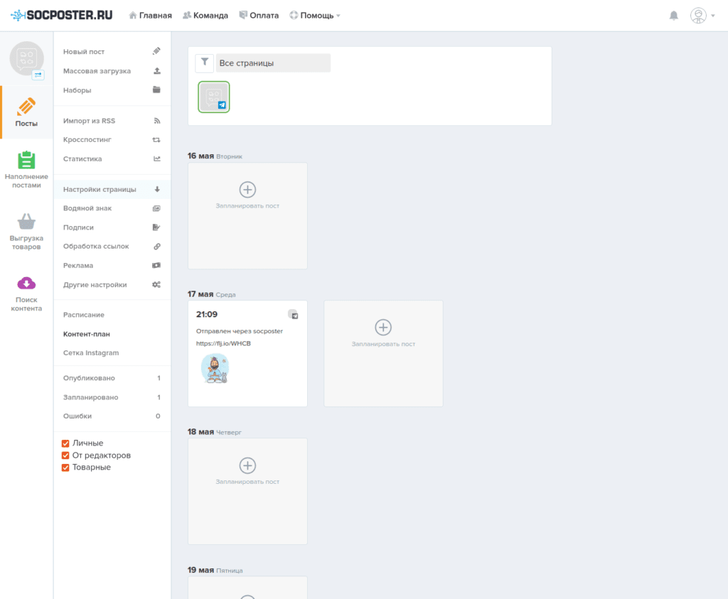 Плюсы: Простой и удобный интерфейс. Большое количество соцсетей. Есть возможность подключить RSS. Есть аналитика.