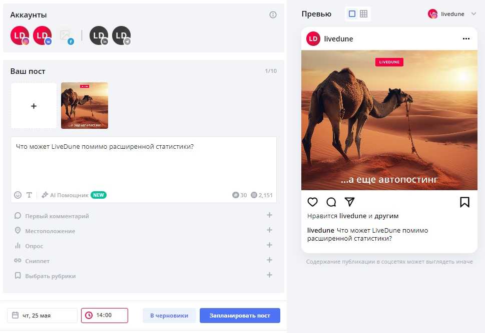 Кросспостинг работает в несколько кликов, превью отображает, как будет выглядеть пост в каждой выбранной соцсети