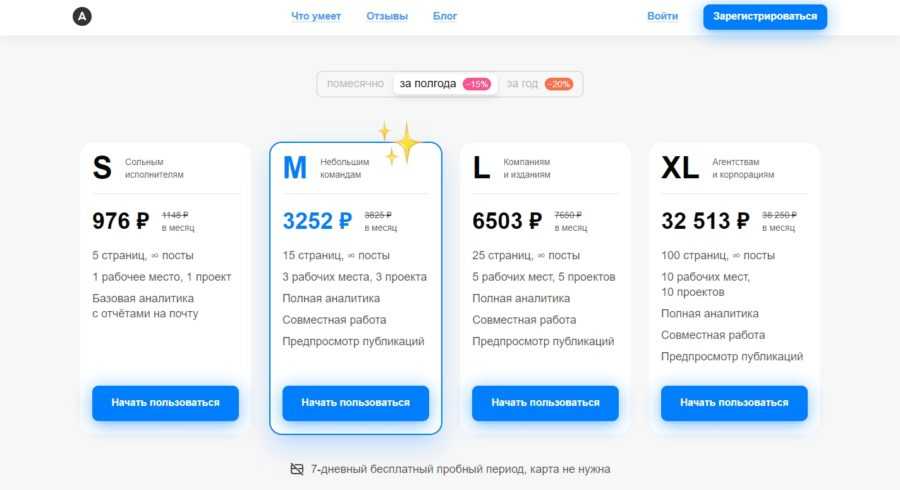 - Start: для работы предоставлено 3 аккаунта, 1 менеджер, 10 отслеживаемых платформ, загрузка файлов до 50 МБ, безлимит на постинг, конструктор мультиссылок и микролендинга. Цена: 1110 рублей/месяц;