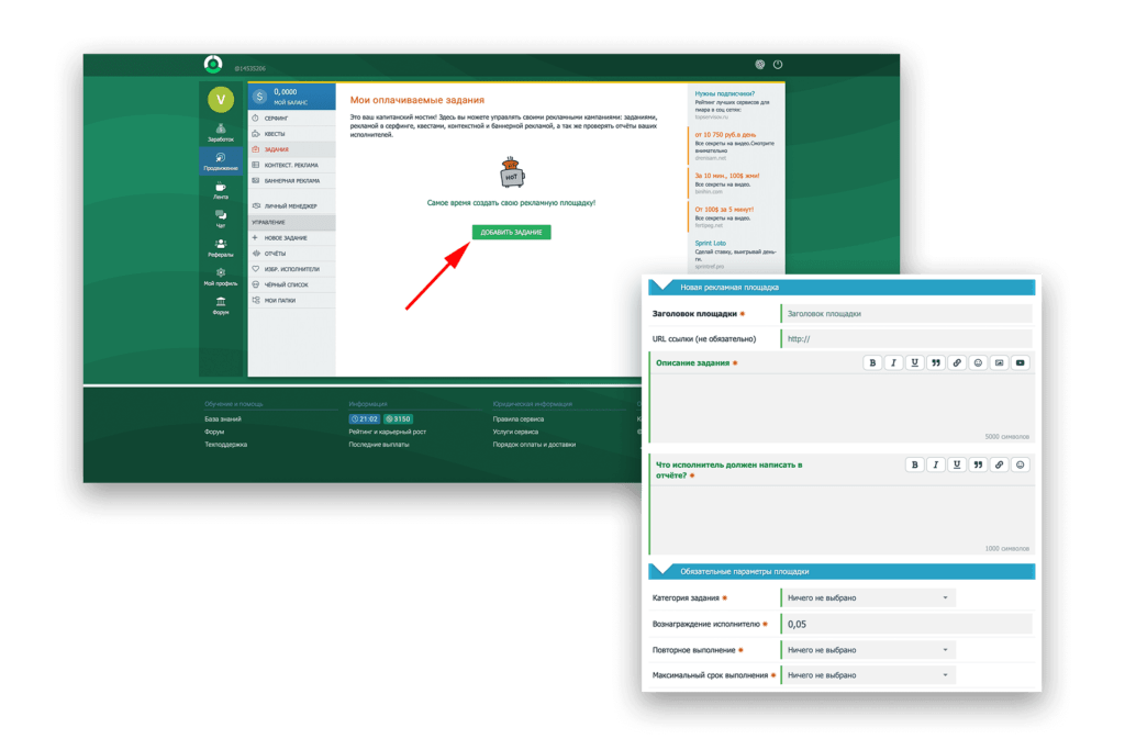 - Seosprint.net. Заданий здесь куча, работников — тоже. Регистрируетесь, пополняете баланс и можете создавать задания.