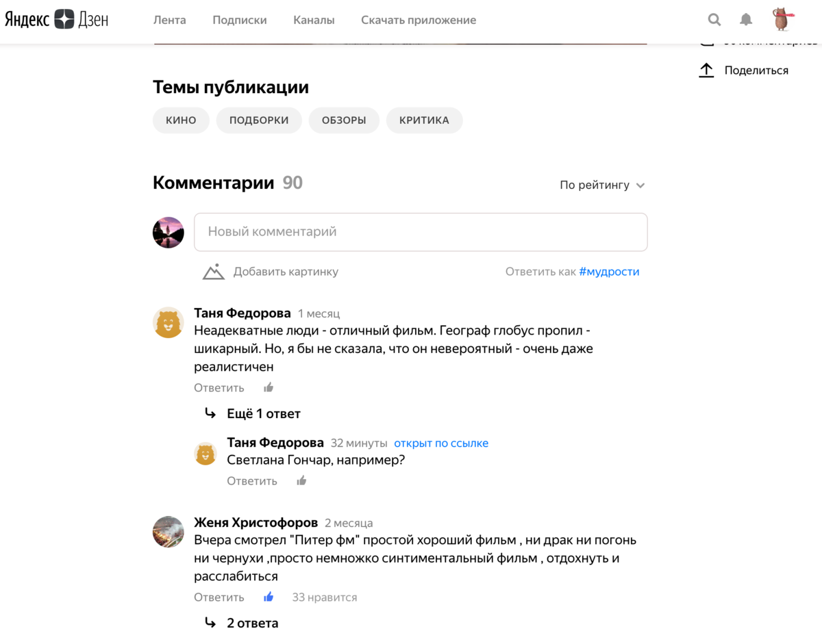 Комментинг — отличный способ привлечь подписчиков на канал. Кстати, блогеры на Дзен выработали довольно интересную практику, которая показала себя эффективной и действует до сих пор. Вам нужно будет найти канал с большим количеством подписчиков. Лучше, если он будет перекликаться с тематикой вашего канала. Например, универсальный вариант, если вы выберете канал СМИ. Далее придется мониторить публикации такого канала. Ваша задача стать одним из первых комментаторов, чтобы ваш коммент видели все, кто придет позже. А затем нужно написать интересный, умный коммент в тему статьи, но с ненавязчивым указанием того, что у вас тоже есть канал. Например: «интересная история, у меня на канале подобные тоже набирают много просмотров».